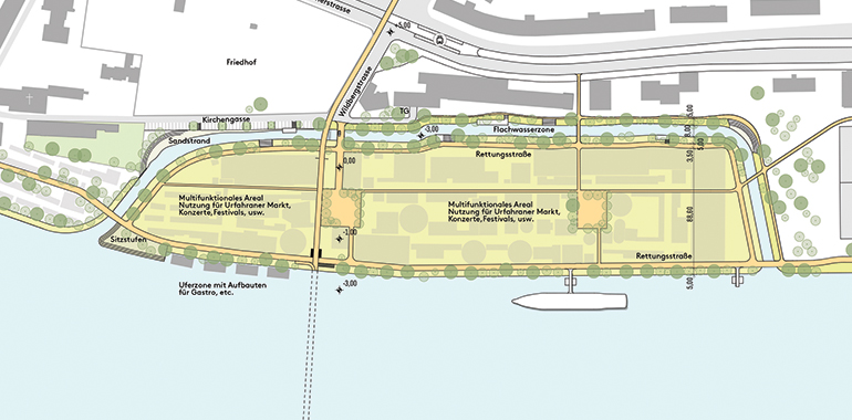 Die Mitte der Insel bliebe hingegen weiter frei und als Veranstaltungsfläche im vollen Umfang erhalten. Der das Gelände umspülende Donau-Seitenarm würde demnach acht Meter breit und bis zu fünf Meter tief ausgeführt werden. Er wäre beim Einlass mit einem Tor abgeriegelt und in Form eines klassischen Altarms ausgeführt – ähnlich dem Winterhafen. Der Vorteil: Das Wasser wäre klar und hätte keine Ablagerungen. Auf ein mögliches Hochwasser hätte das Projekt keinen Einfluss – im Gegenteil: Für die Donau wäre sogar mehr Platz.