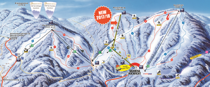 Neun Lifte und 20 Pistenkilometer – die Skiarena am Hochficht kann sich durchaus sehen lassen. Heuer neu: die erst echte Kabinenbahn im Mühlviertel, die den Endlos-Schlepper auf den 1.281m hohen Reischlberg ersetzt. 10,5 Millionen Euro wurden investiert, 2.800 Personen können in nur einer Stunde befördert werden, die Fahrzeit beträgt nur 5,5 Minuten– beim alten Schlepper warens endlos lange 17 Minuten.