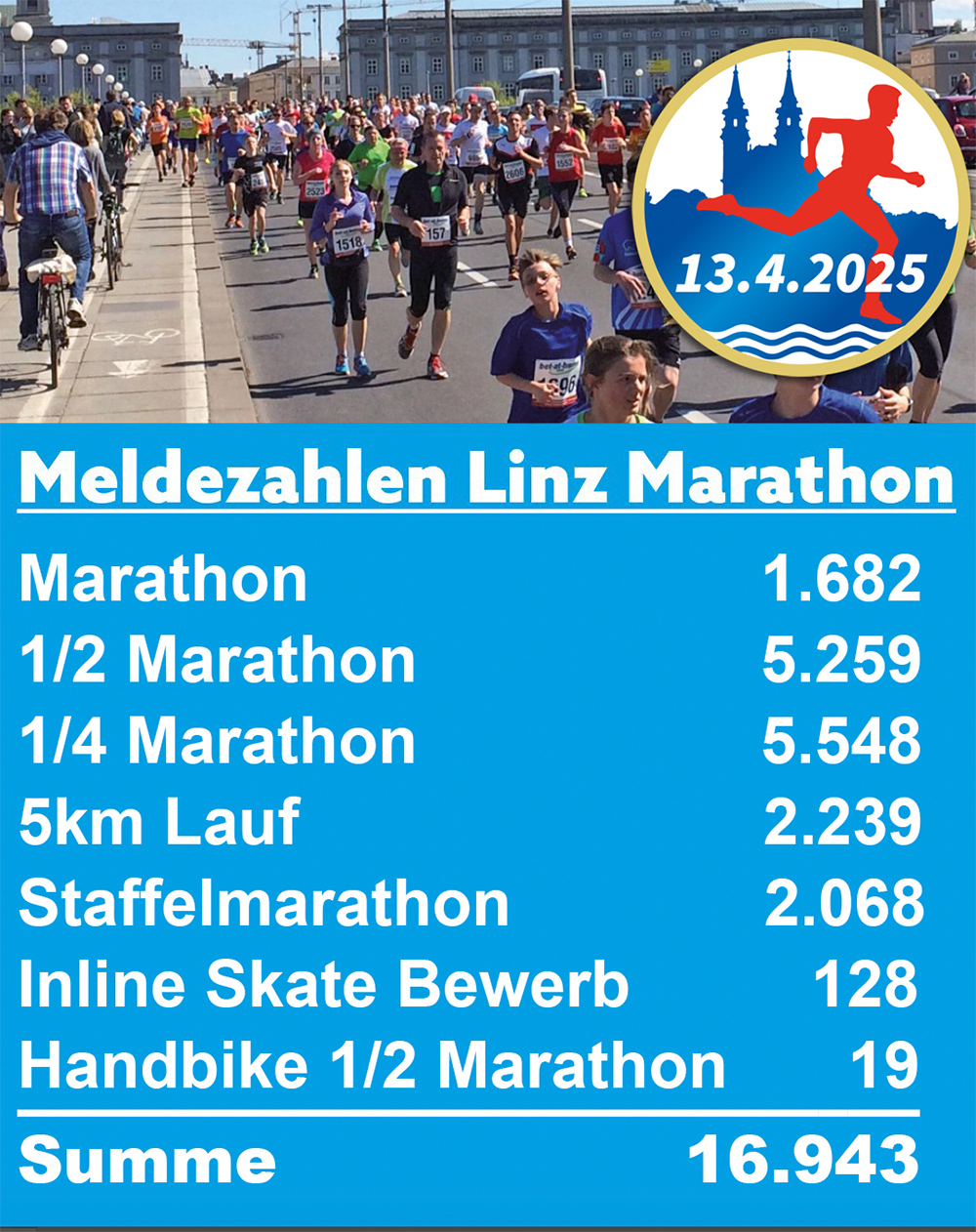 Haupt-Frequenzbringer ist aber einmal mehr nicht der Marathon, sondern die kürzeren Distanzen über 5, 10,55 und 21,1 Kilometer. Erfreulich ist der Anmeldeboom über die volle 42,2km-Distanz mit 1.682 Nennungen, die in den letzten vier Jahren nie mehrt als 751 Finisher verzeichnete. Das LINZA stadtmagazin wünscht allen Teilnehmern eine flotte Sohle!