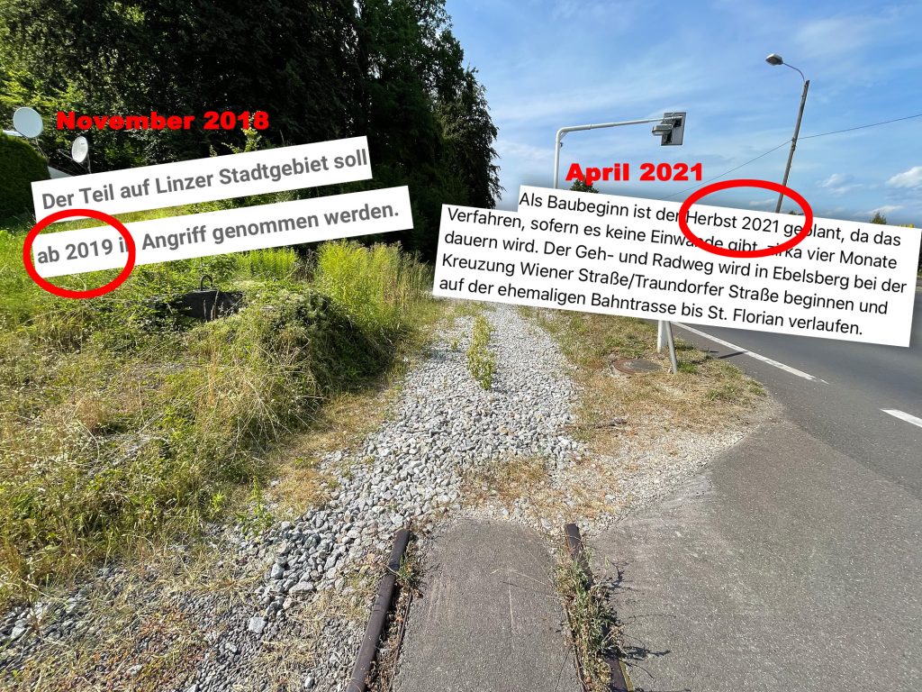 „Mit der Einleitung des Behördenverfahrens für die straßenrechtliche Verordnung ist der zukünftige Radweg auf der ehemaligen Trasse der Florianerbahn ab sofort auf Schiene. Als Baubeginn ist der Herbst 2021 geplant, da das Verfahren, sofern es keine Einwände gibt, zirka vier Monate dauern wird. Der Geh- und Radweg wird in Ebelsberg bei der Kreuzung Wiener Straße/Traundorfer Straße beginnen und auf der ehemaligen Bahntrasse bis St. Florian verlaufen“ versprach Bürgermeister Klaus Luger zuletzt im April 2021. Aber auch da passierte – trotz Wahljahr – wieder nichts.