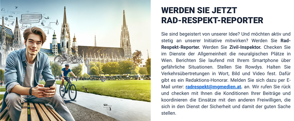 „Wir lieben Radler – die Kultivierten“ – so das Motto der Initiative „RadRespekt“, die von der MG Mediengruppe rund um Christian Mucha ausgeht. „Es gibt Regeln für respektvolles Verhalten im Verkehr, die auch für Radfahrer gelten sollten. Die Privilegien für Zweiradnutzer wurden manchmal überstrapaziert. Es gibt sowohl respektvolle als auch rücksichtslose Radfahrer, die andere gefährden, insbesondere ältere Menschen, Kinder und Hunde. Diese Seite zeigt, was einen kultivierten Radfahrer ausmacht und wo das System Schwachstellen hat. Wir liefern Vorschläge für bessere Identifizierung von Rowdys und verbesserte Gesetze“, heißt es auf der Seite Radrespekt.at: „Während die Einen sich an die Regeln halten, düsen die Anderen rücksichtslos durch Fußgängerzonen, fahren gegen Einbahnen oder quer über den Gürtel.“