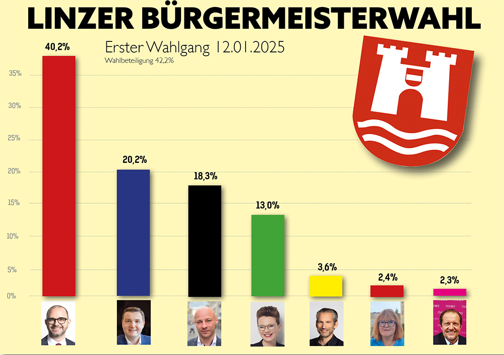 Das Endergebnis der Linzer Bürgermeisterwahl ist da – mit einem in absoluten Zahlen doch überraschenden Ergebnis. Fix ist: Am 26. Jänner kommt es zu einer rotblauen Stichwahl zwischen Dietmar Prammer (SPÖ) und Michael Raml (FPÖ).