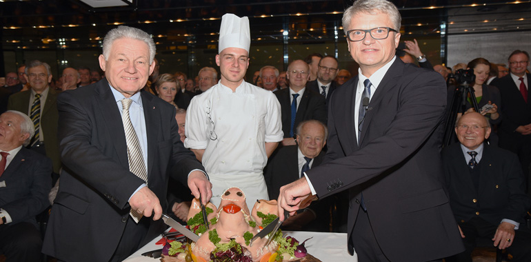 Den Auftakt für das anschließende gemütliche Beisammensein bildete in traditioneller Weise zum bereits 27. Mal der Anschnitt des Sauschädels gemeinsam mit Landeshauptmann Josef Pühringer.