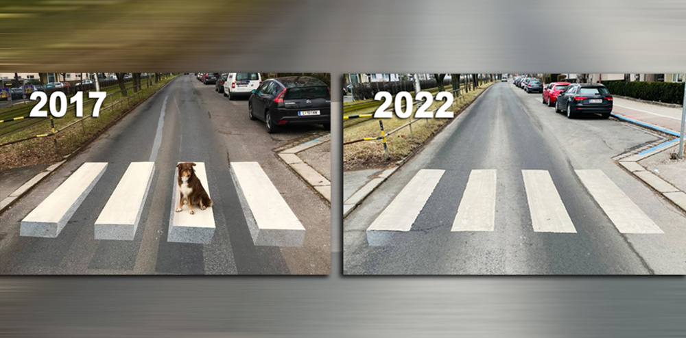 Es war damals der erste 3D-Zebrastreifen Österreichs. Vorbild war der isländische Ort Vegamalun, wo zuvor ein derartiger Zebrastreifen aufgepinselt wurde. Das 5.000 Euro-Einmalprojekt taugte damals für österreichweite Schlagzeilen – und damit war der Zweck wohl auch erfüllt, denn es gab weder Untersuchungen, ob der Zebrastreifen irgendeine Auswirkung auf das Fahrverhalten hat, noch wurde die verwitternde Farbe jemals nachgebessert.