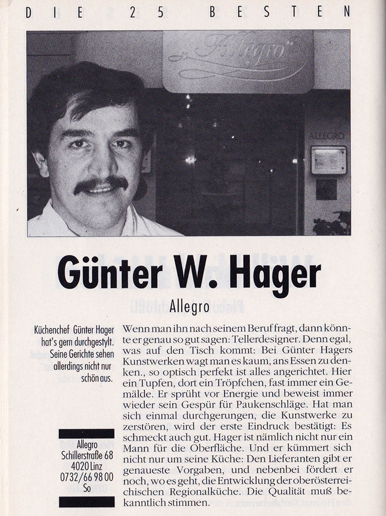 Günter Hager – Ihnen gelang Anfang der 1980er-Jahre das Kunststück, als eines von nur 50 Lokalen österreichweit eine Gault Millau Haube zu erkochen. Das war damals absolutes Neuland für die provinzielle, versmogte und dreckige Stahlstadt Linz.