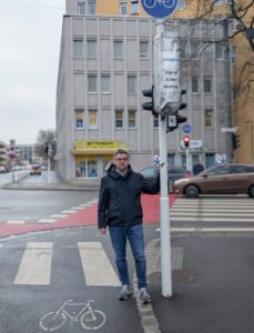FP-Verkehrssprecher Manuel Matsche vor der kaltgestellten Radfahrerampel in der Lederergasse. (Foto: zVg)