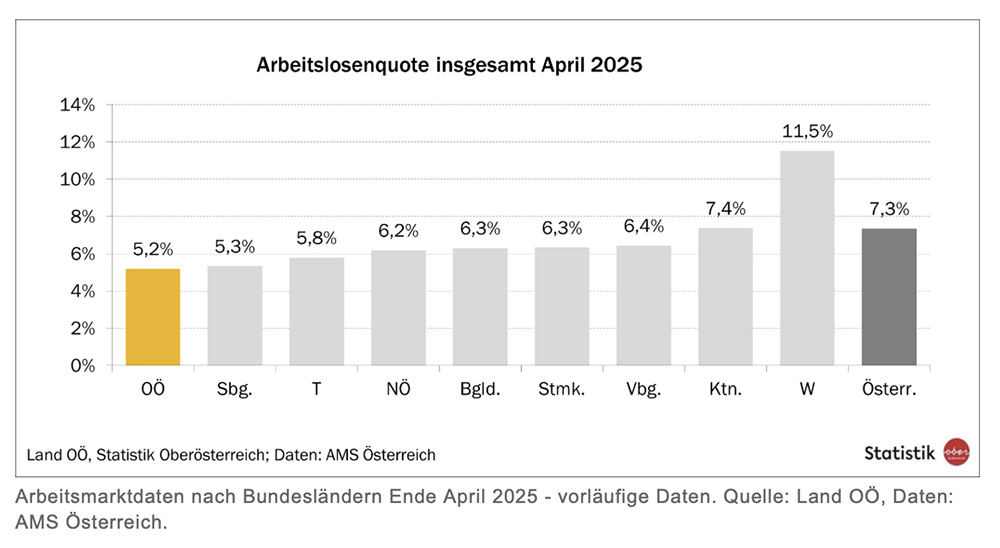 Mit 5,2 Prozent weist Oberösterreich im April die niedrigste Arbeitslosenrate aller Bundesländer auf – vor Salzburg mit 5,3 Prozent und Tirol mit 5,8 Prozent. Ebenso liegt die oö. Arbeitslosenquote deutlich unter dem Bundesschnitt von 7,3 Prozent. Das dritte Krisenjahr in Folge zeigt aber gerade auf Oberösterreich als führendes Industrie- und Export-Bundesland starke Auswirkungen.