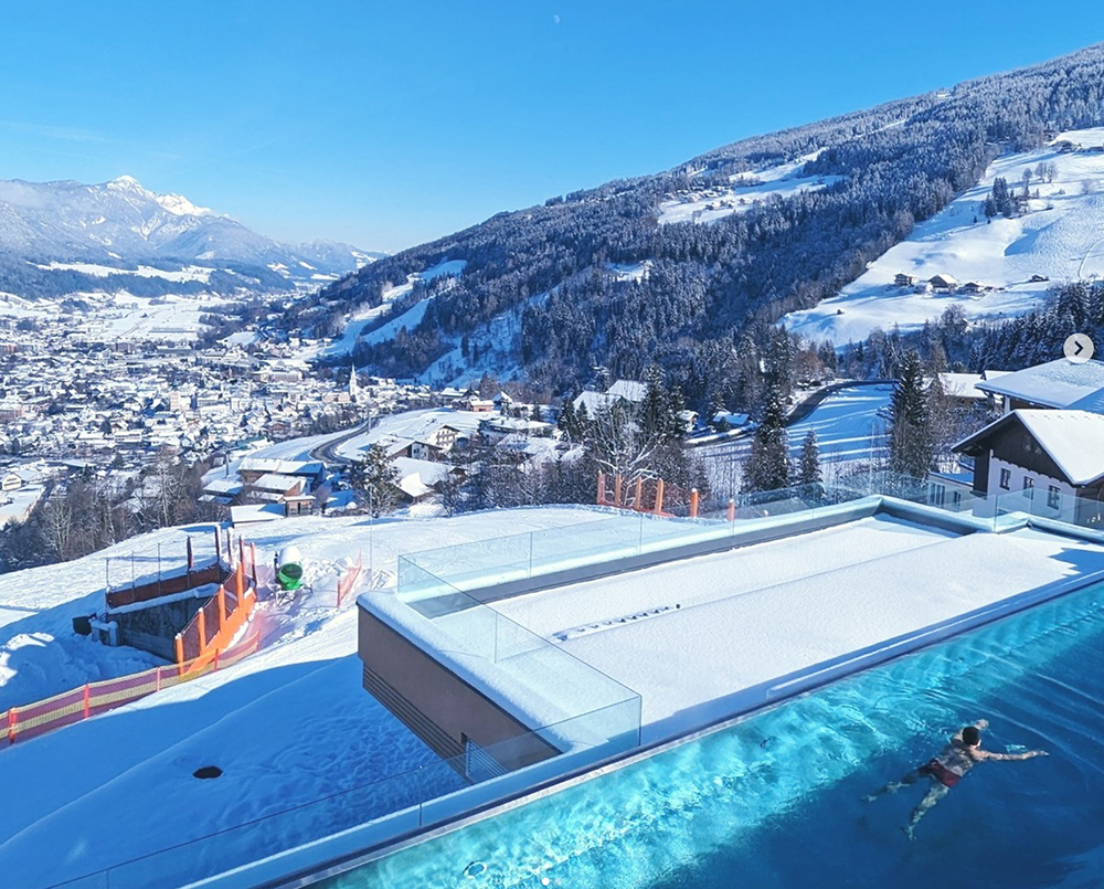 Atemberaubend: das Schütterhof Spa, der 2.000 Quadratmeter große Wellness- und Beautybereich. Der beste Platz nach einem Ski- oder Wandertag sind der Infinity-Pool (32°C), die Sauna, die Solegrotte oder der Whirlpool. Hier kann man übrigens schon vor dem Frühstück in den Tag starten, im Fitnessraum Gewichte stemmen oder auf dem Laufband trainieren. Kosmetische Behandlungen, wohltuende Massagen und entspannende Packungen gibt‘s ebenfalls.