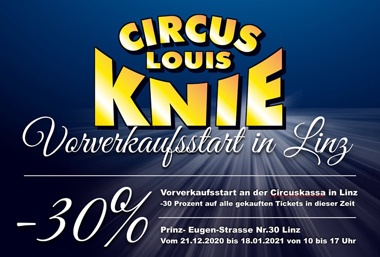Wie viele andere hat die Corona-Krise auch den traditionsreichen Circus Louis Knie voll erwischt: keine Auftritte bedeutet auch keine Einnahmen. Jetzt bietet der in Linz gestrandete Circus eine besondere Aktion: Minus 30% auf alle Tickets für das Gastspiel in unserer Stadt. Ab 18. Jänner 2021 sollen wieder Vorstellungen steigen.