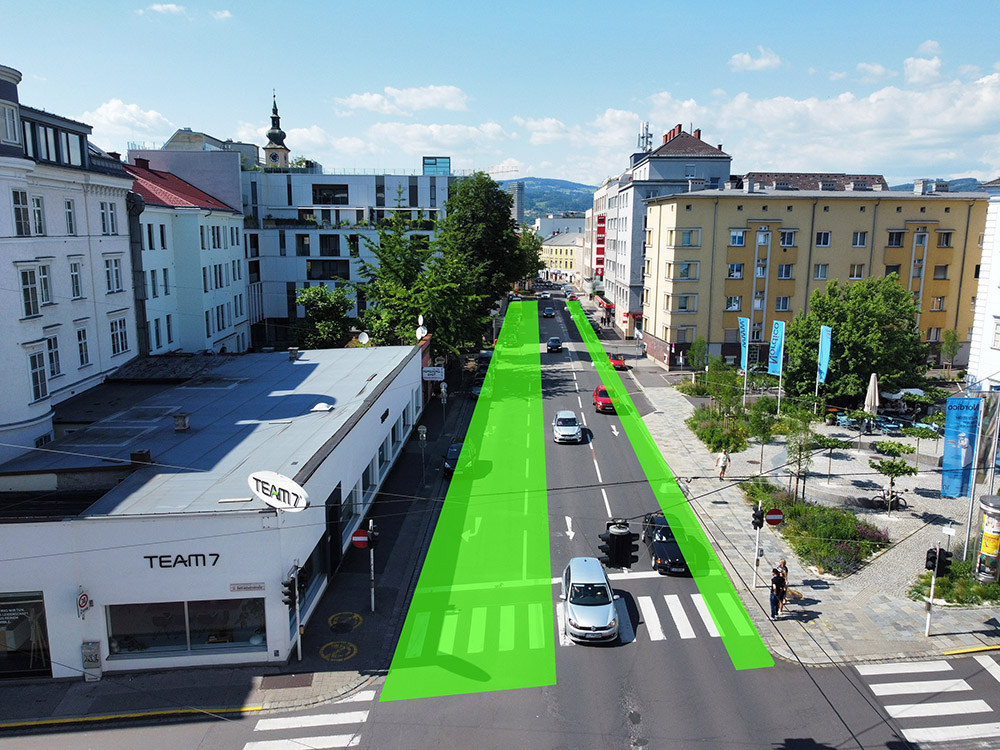 Herzstück ist der Abschnitt zwischen Graben und OK-Platz: Obwohl nur zwei Auto-Fahrspuren nötig wären, ist die Fahrbahn um ein vielfaches breiter. Im bestimmten Abschnitt stünden bis zu sechs Meter für eine zusätzliche Nutzung zur Verfügung, ohne die Leistungsfähigkeit der Straße zu beeinträchtigen.