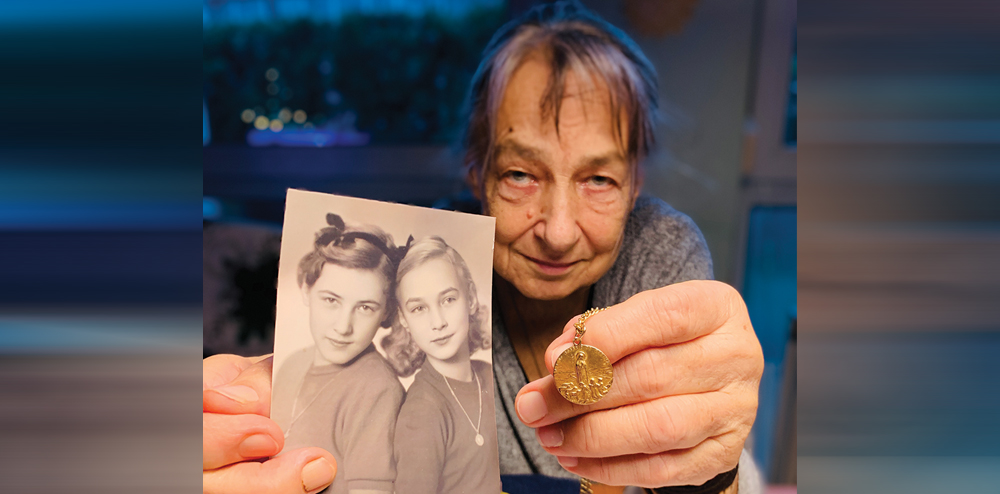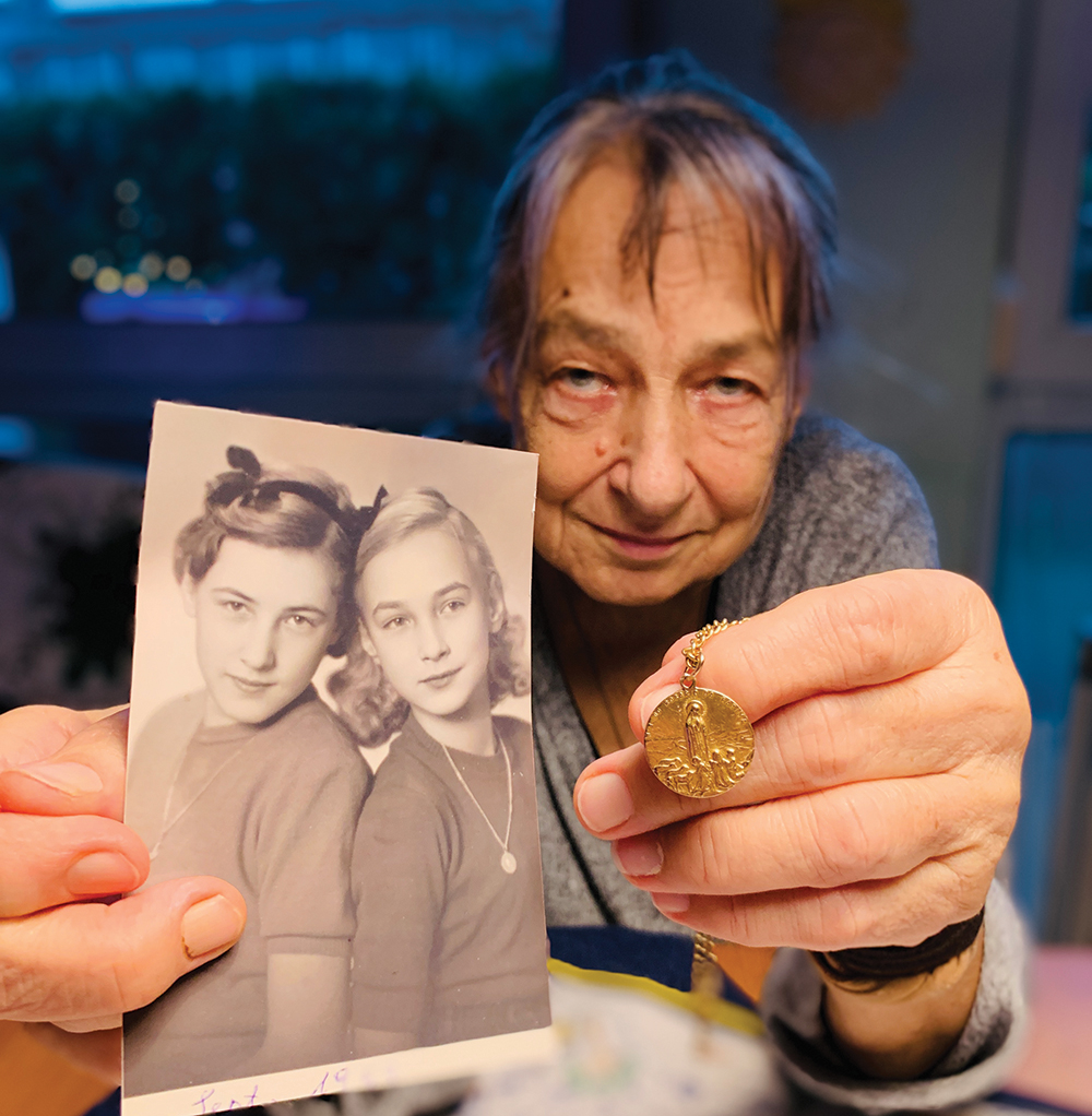 Mein Vater war Zollbeamter. Einmal hat er von einer Waggonladung Bananen drei Stück mitnehmen dürfen. Das war für uns wie von einer anderen Welt. Es mangelte an allem, selbst an Milch, Brot und den einfachsten Dingen. Mein Vater ging immer wieder „Hamstern“ – das waren illegale Märkte, wo man Möbel, Schmuck oder andere Dinge gegen Essbares tauschte. Essen war die kostbarste Währung überhaupt. 1950 durften meine Schwester Hilda und ich dank der Caritas für ein Jahr zu Pflegeeltern nach Portugal. Auf der Reise dorthin hab‘ ich meine erste Orange gegessen. Ich fühlte mich wie im Paradies. Beim Abschied bekam ich ein goldenes Amulett, das ich heute noch trage.