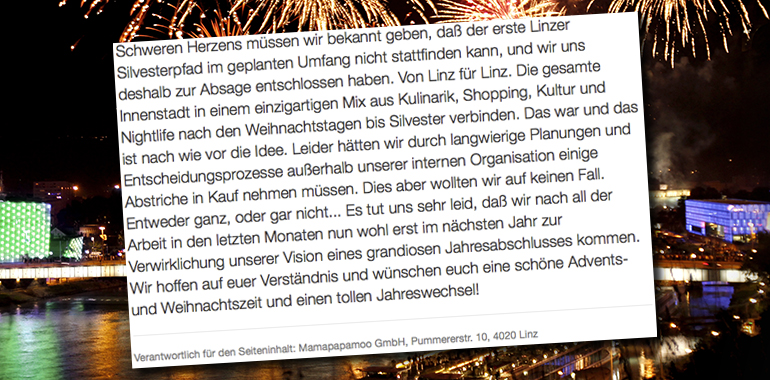 Laut der offiziellen Homepage www.linzer-silvesterpfad.at ist der Event jetzt geplatzt – und das gerade mal vier Wochen vor dem Jahreswechsel. Veranstalter Ferenc Fellner: „Schweren Herzens müssen wir bekannt geben, dass der erste Linzer Silvesterpfad im geplanten Umfang nicht stattfinden kann, und wir uns deshalb zur Absage entschlossen haben… Leider hätten wir durch langwierige Planungen und Entscheidungsprozesse außerhalb unserer internen Organisation einige Abstriche in Kauf nehmen müssen… Es tut uns sehr leid, daß wir nach all der Arbeit in den letzten Monaten nun wohl erst im nächsten Jahr zur Verwirklichung unserer Vision eines grandiosen Jahresabschlusses kommen. Wir hoffen auf euer Verständnis und wünschen euch eine schöne Advents- und Weihnachtszeit und einen tollen Jahreswechsel!“