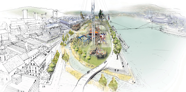 „Wir waren uns relativ schnell einig, wohin die Reise gehen sollte“, sagt Andreas Henter, der sich mit den Branchenkollegen Martin Urmann, Markus Rabengruber und Gerald A. Steiner zum Architekturkollektiv GUT zusammentat, um dem Jahrmarktgelände einen neuen Anzug zu verpassen. „Der Projektname ‚Reif für die Insel‘ war für uns im Denkprozess wie ein Befreiungsschlag. Das löst bei jedem spezielle Bilder aus – und diese sind durchwegs positiv. Sobald man von einer Insel spricht, schafft man einen speziellen Ort. Jeder hat beim Begriff Insel seine eigene Fantasie, es hat was mit Freiheit zu tun, mit Rückzug“, sagt Andreas Henter. Alleine das Wortspiel löst das Thema von der Stadt im positiven Sinn ab und ergibt was Neues. Der zweite Ansatz: „Wir wollten eine Art Skyline schaffen und nicht Linz an die Donau, sondern den Fluss in die Stadt bringen, die beiden vernetzen“, ergänzt Martin Urmann.