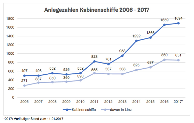 Die Donau ist ein echter Quotenbringer für den oberösterr. Tourismus: 1.659-mal legten Kreuzfahrtschiffe 2016 in Oberösterreich an. Vor zehn Jahren – 2006 – waren es erst 497. In dieser kurzen Zeit hat sich die Zahl der Anlandungen somit mehr als verdreifacht – und es ist kein Ende dieses Booms abzusehen. Aber auch die Linien- und Ausflugsschifffahrt beeindruckt mit starken Zahlen: Im Vorjahr konnten hier bereits über 526.000 Passagiere auf der oberösterreichischen Donau gezählt werden.