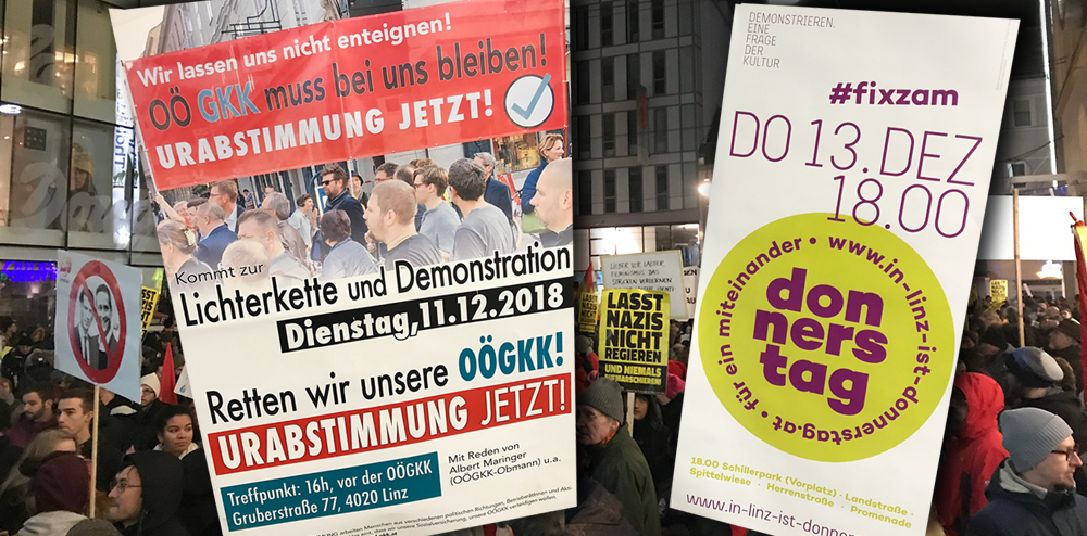 Weihnachtsfrieden? Nix da: Gleich zwei Großdemos gegen die Regierung stehen in der kommende Woche in Linz an. Am Dienstag (11.12.) bitten die Betriebsräte der GKK zur „Lichterkette und Demonstration“. Und nur zwei Tage später steigt die zweite Auflage der Donnerstags-Demo der Linzer Grünen und der SPÖ-nahen „Gesellschaft für Kulturpolitik“.
