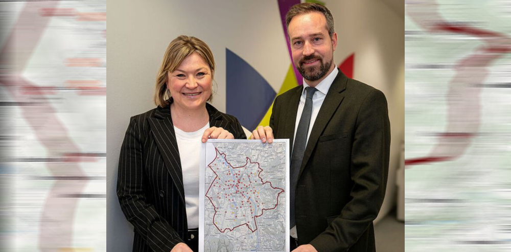 Titelfoto: Planungsstadträtin Anna Schiester und LH-Stv. Stefan Schnöll mit dem Standortplan von S-Bike.