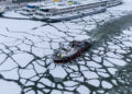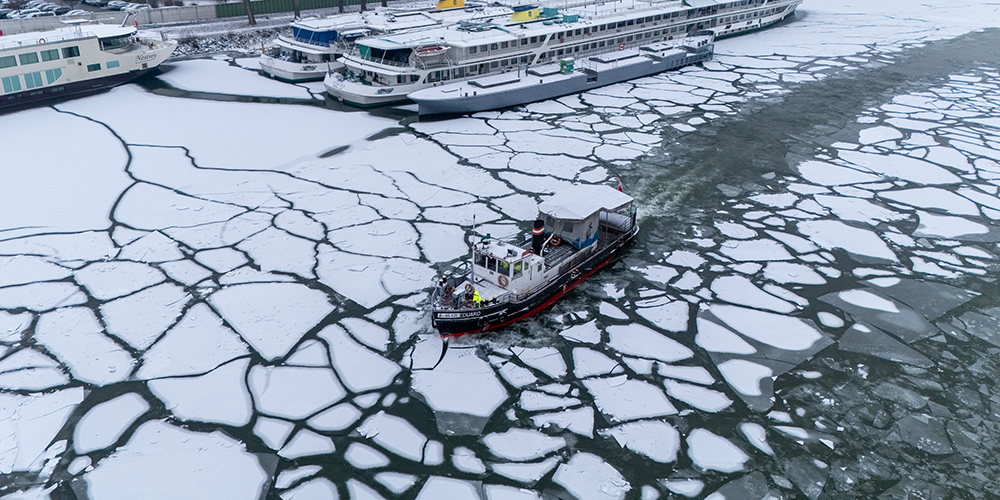 Linz, 8. Jänner 2026: Der Eisbrecher „MS EDUARD“ der Linz AG ist im Linzer Hafen im Einsatz und bricht Eisflächen, um die Schiffbarkeit des Hafenbeckens sicherzustellen. (Foto: LINZ AG / fotokerschi)