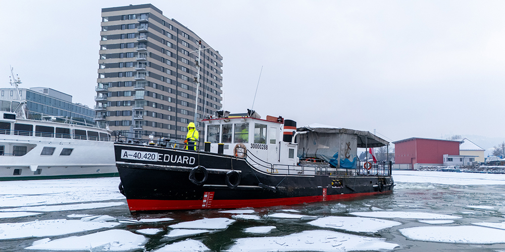 Der Winter hat auch den Linzer Hafen fest im Griff. Mit einem Gewicht von rund 60 Tonnen und einer Länge von knapp 22 Metern kämpft sich die MS Eduard durch die derzeit rund fünf Zentimeter dicke Eisschicht. Der stahlverstärkte Bug und ein dicker Stahlblechsockel schützen das Schiff vor der harten Eisdecke.