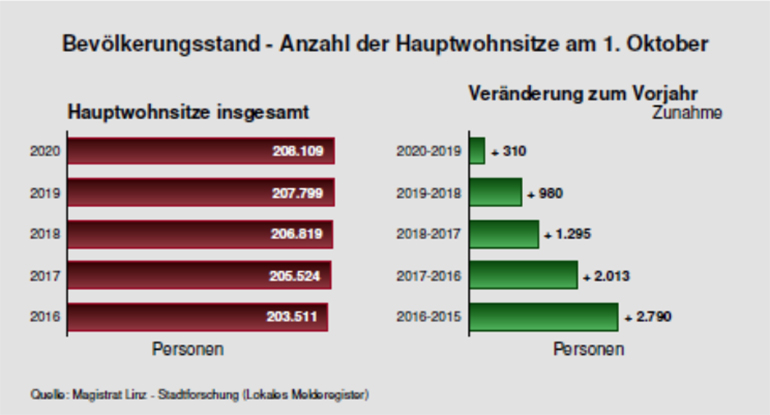 Wie viele andere Städte erlebte auch Linz in den 1990er-Jahren große Bevölkerungseinbußen aufgrund der Übersiedelung von vorwiegend Familien in den Linzer „Speckgürtel“. Diese flüchteten aus der staubigen Donaumetropole an den Stadtrand und in den Grüngürtel. Anfang der 2000er nahm aber auch in den Städten der Zuzug wieder zu – vor allem auch durch Einwanderung. Seit 2001 wuchs Linz um über 24.000 Bewohner – ein Plus von 13,3 Prozent. Im Vergleich zum Vorjahr ist die Bevölkerungszahl ,nur‘ um 400 angewachsen, während in den Jahren zuvor die Zuwachsraten noch um bis zum Sechsfachen höher lagen als derzeit.
