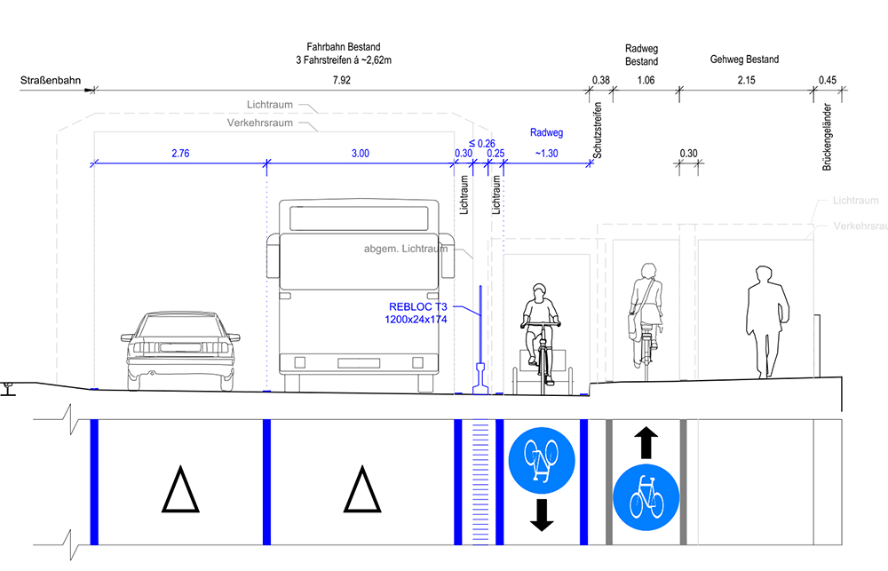 Der gemeinsam von Radlern und Fußgängern benutzte Gehsteig führt häufig zu Konflikten. Mit der Einrichtung der provisorischen Radfahrstreifen soll das der Vergangenheit angehören. In beiden Fahrtrichtungen bekommen Radfahrer künftig zusätzlich 1,30 Meter mehr Platz, ergänzt durch 25 Zentimeter Sicherheitsabstand. Die neuen Radspuren werden durch bis zu 1,5m hohen Leitwänden von der Fahrbahn getrennt. Die verbleibenden zwei Fahrspuren für. den motorisierten Verkehr werden auf ca. je drei Meter verbreitert.