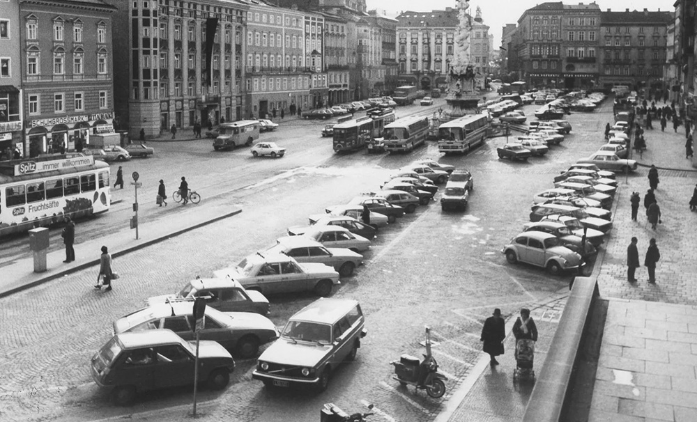 Bis 1979 war der Linzer Hauptplatz nicht viel mehr als ein riesengroßer Parkplatz. (Foto: Archiv der Stadt Linz)
