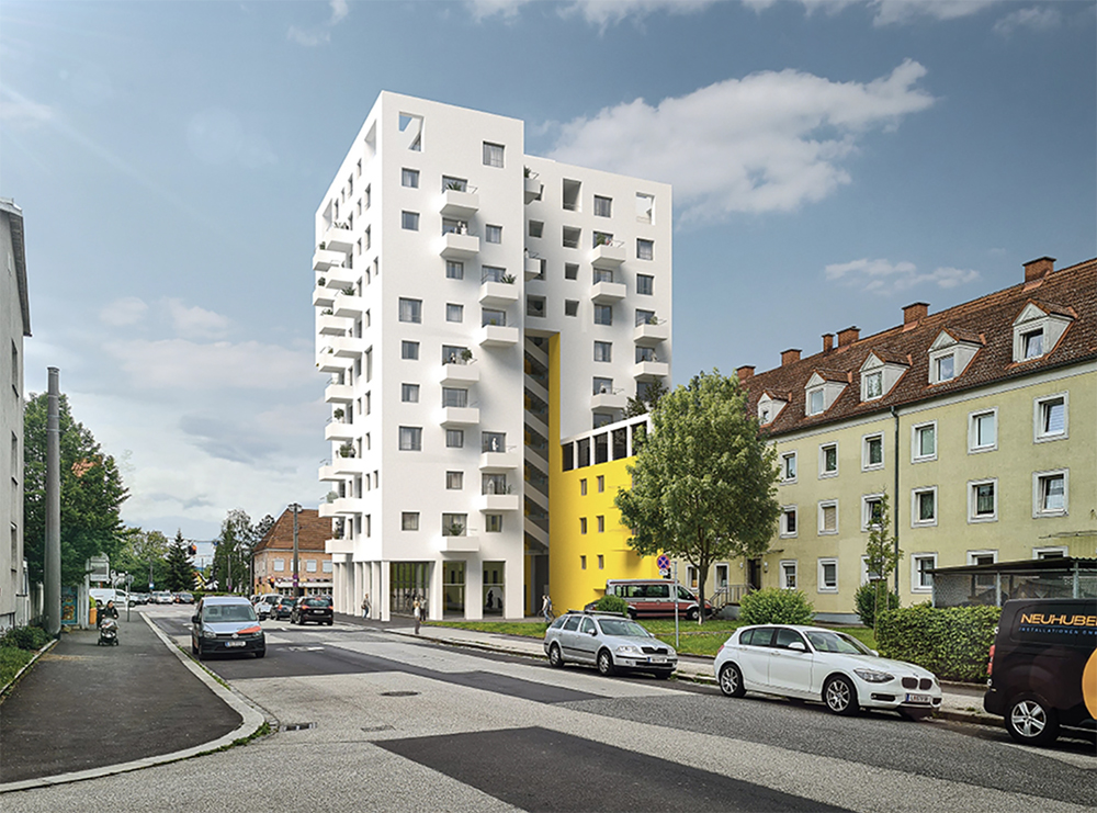Der Bau entsteht an der Kreuzung Dauphinestraße/Haidgattern, wo sich früher ein Kino, dann ein Meindl- und schließlich ein BILLA-Supermarkt befand. Verantwortlich für den Bau, der eine absolute Landmark in der Neuen Heimat werden wird, zeichnet Andreas Kleboth vom Architekturbüro Kleboth Kleboth und Dollnig.