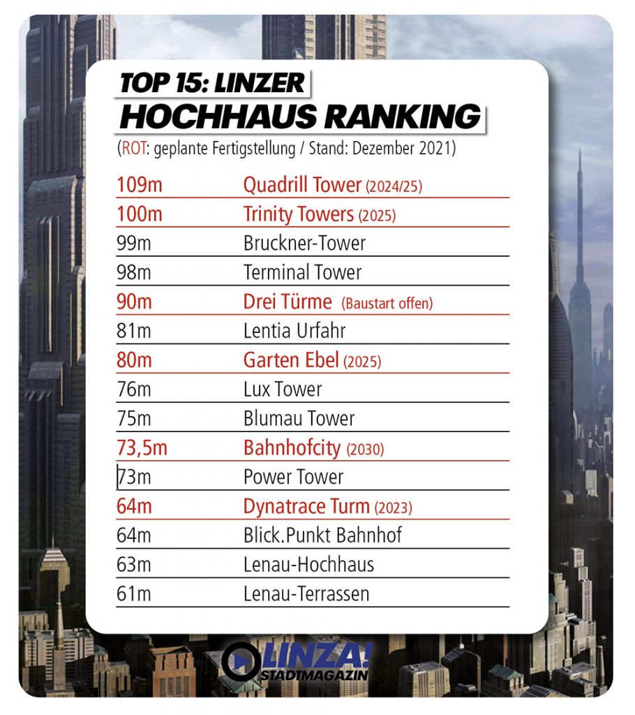 Fix ist hingegen das Projekt TRINITY, das ebenfalls aus drei Türmen besteht und bis zu 100 Meter nach oben geht (Start 2023). Und in der geplanten Bahnhofscity am ehemaligen Gelände der Hauptpost werden gleich elf Türme mit einer Höhe von bis zu 73,5 Metern entstehen. Aber auch hier stehen die Zeichen auf Hold, denn bei der Projektpräsentation war die Fertigstellung mit 2025 angekündigt, aktuell wird bereits von 2030 gesprochen…