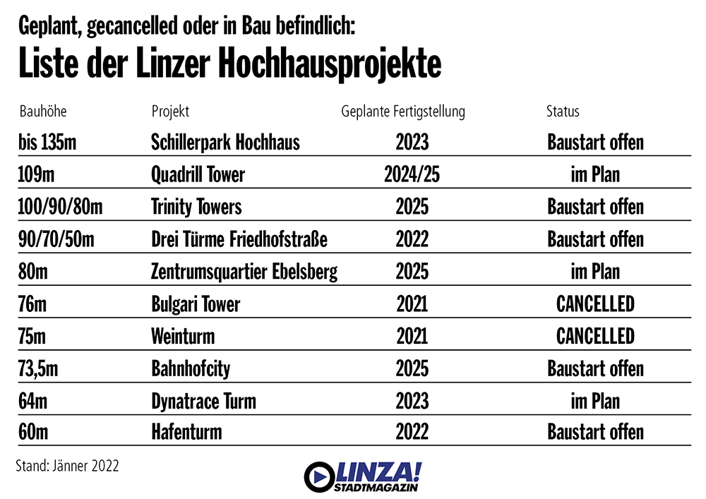 Nicht mehr aktuell sind der Bulgari Tower (76m) am Bulgariplatz und der Weinturm in Urfahr. Die Projekte wurden im Vorjahr bzw. bereits 2018 abgeblasen – gut möglich, dass das aufgrund der geänderten Marktbedingungen auch dem einen oder anderen weiteren geplanten Linzer Hochhaus passiert.