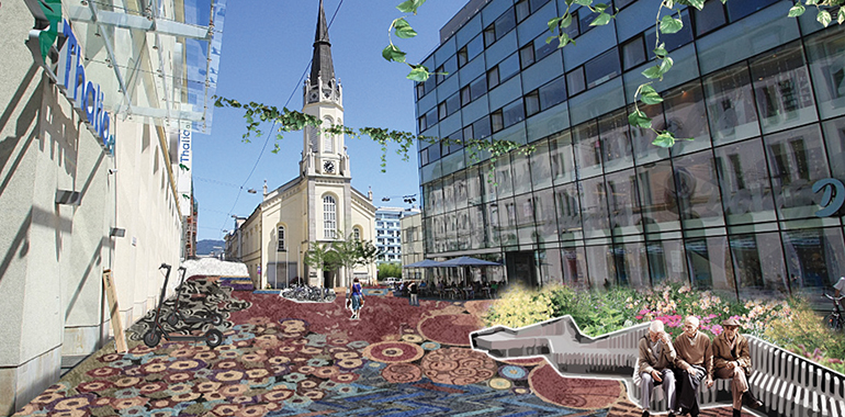 Es wird aber auch groß gedacht: Eine U-Bahn unter der Landstraße würde an der Oberfläche viel Lebensraum freisetzen, hofft Freiraumplaner David Dobetsberger auf einen „Befreiungsschlag. Die Stadt der Zukunft soll verzaubern, versorgen und lebenswert sein. Die Stadt der Zukunft soll nicht krank machen. Die Stadt der Zukunft soll einladen zu kommunizieren. Die erste Maßnahme für die prominenteste und frequentierteste Einkaufsstraße Oberösterreichs ist die Tieferlegung der Straßenbahn. Sie wird zu einer U-Bahn. Das Potential, das solch eine Maßnahme mit sich bringen würde, ist hoch. Die Stationen der neuen U-Bahn-Straßenbahn werden auf der Landstraße auf drei reduziert. Der erste Ausstieg wird am Volksgarten möglich sein, der Zweite am Martin-Luther-Platz, der Dritte am Taubenmarkt. Grüninseln mit Bäumen werden in die Mitte der Landstraße platziert. Die bereits viel diskutierten Vorteile der grünen Stadt wie CO2-Speicher, Feinstaubfilter, Klimaregulation, Lärmfilter und dadurch eine Erhöhung der Lebensqualität würden hierbei greifen. Begrünung alleine würde zuwenig sein. Das Potential liegt auch in verschiedensten Kommunikationsmöglichkeiten, Rückzugsmöglichkeiten müssen genauso gegeben sein wie Bühnen oder die Möglichkeit Feste zu feiern. Spielflächen für Kinder und auch Erwachsene, Wasserflächen zum Abkühlen sind weitere Highlights dieses Masterplans.“
