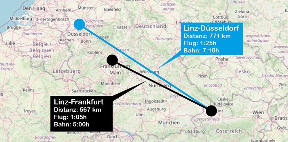 Klar, Linienflüge von Linz nach Salzburg oder Wien machen bei Bahn-Fahrzeiten von unter zwei Stunden wenig Sinn. Die für den Flughafen Linz so wichtige Linienverbindung nach Frankfurt ist aber ein perfektes Beispiel, dass eine generelle Streichung von Kurzstrecken absoluter Humbug wäre. Die (mit dem Auto) 567 km lange Flugverbindung wird fast durchwegs von Geschäftsleuten oder Reisenden, die via Frankfurt (dem viertgrößten Airport Europas) weiter in die ganze Welt fliegen, genutzt. Auch die zweite Linienverbindung, jene von Linz nach Düsseldorf, wird großteils von Geschäftsreisenden und Umsteigern in Anspruch genommen.