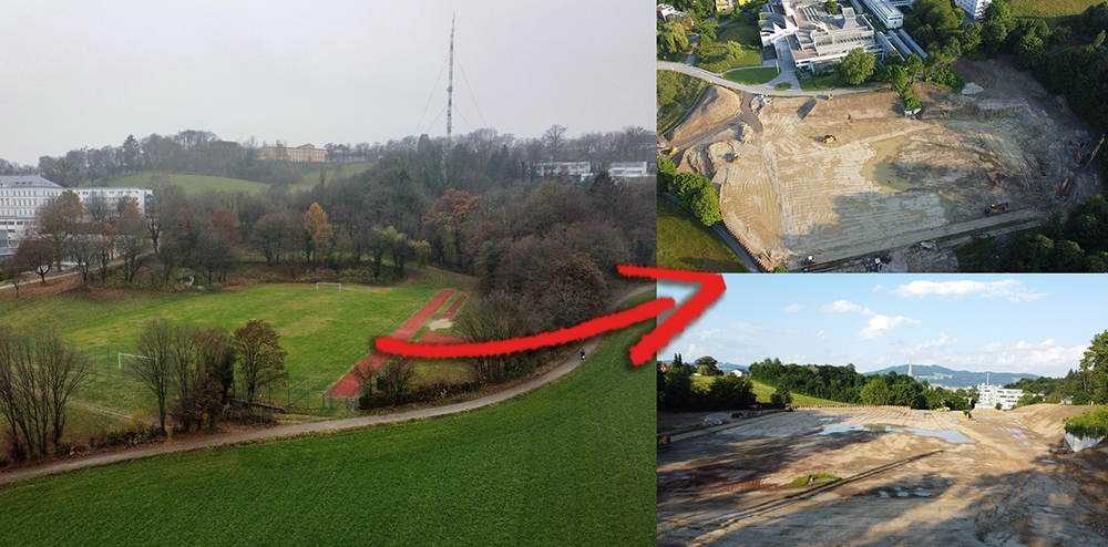 Aufregung am Freinberg, wo am bisherigen Sportplatz der Pädagogischen Hochschule derzeit eine „naturnahe“ Leichtathletikarena errichtet wird. Die Baustelle lässt die künftigen Dimensionen erahnen. Kritik gibt es u.a. auch, weil für die neue Anlage laut Anrainern um die 50 Bäume gefällt werden mussten. Nötig wurde das Projekt, weil die Leichtathleten nach dem Bau des neuen LASK-Stadions ihre alte Heimat auf der Gugl verloren.