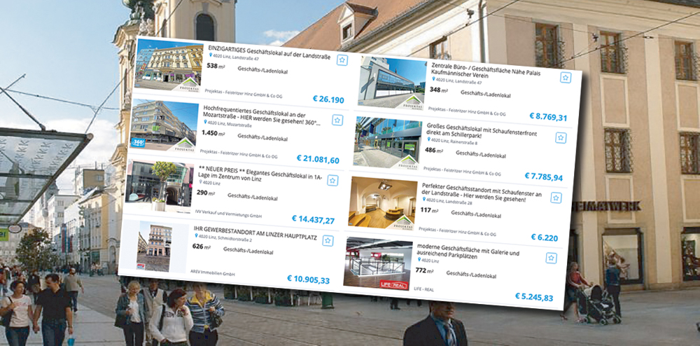 • Ein ehemaliges Modengeschäft mit 290m2 am Seiteneingang zur Linzerie ist aktuell um 17.598 Euro Monatsmiete (+60.000 Euro Kaution und drei Monatsmieten Provision) zu haben.