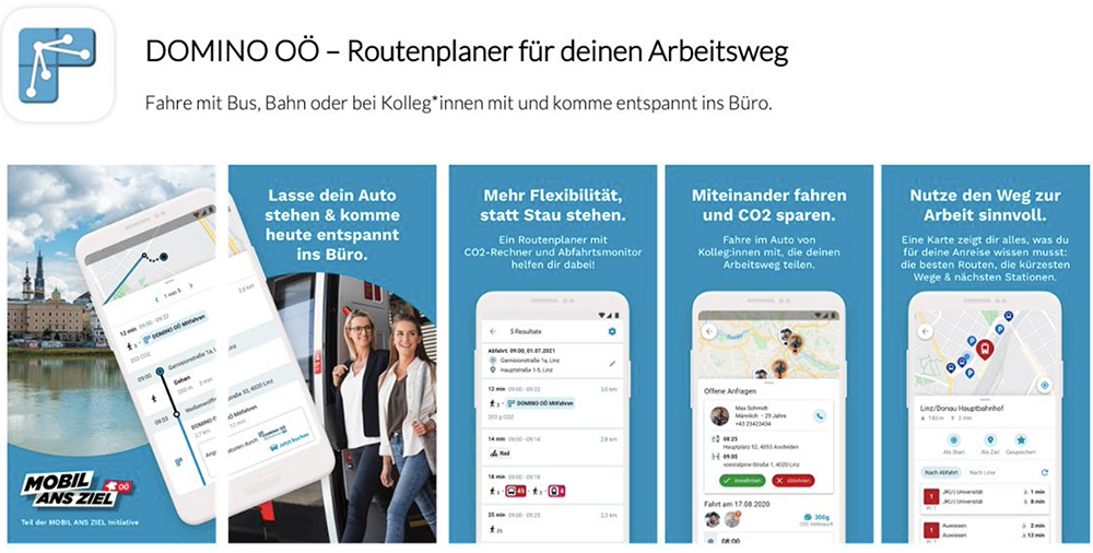 Im Rahmen eines Forschungs-Leitprojekts wurde in Oberösterreich die App DOMINO OÖ entwickelt. Die Mobilitäts-App bietet Usern, die regelmäßig pendeln, intermodale Mobilitätsangebote für ihre Arbeitswege. Die Kernfunktionen der Mobilitäts-App bieten neben einer Mitfahrbörse auch einen intermodalen Routenplaner für den öffentlichen Verkehr, Sharing-Services sowie Park- and-Ride und Bike-and-Ride Angebote. Einzigartig ist dabei die Verknüpfung der verschiedenen Angebote.