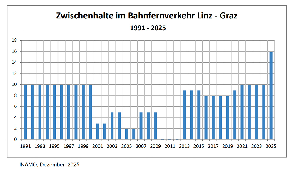 Der in den letzten 31 Jahren maximale Wert an Zwischenhalten im Fernverkehr zwischen Linz und Graz von 10 Halten wird im aktuellen Fahrplan um 60 % auf 16 Stopps erhöht – in der Praxis bedeutet das, das, dass alle 15 Kilometer ein Stopp erfolgt.