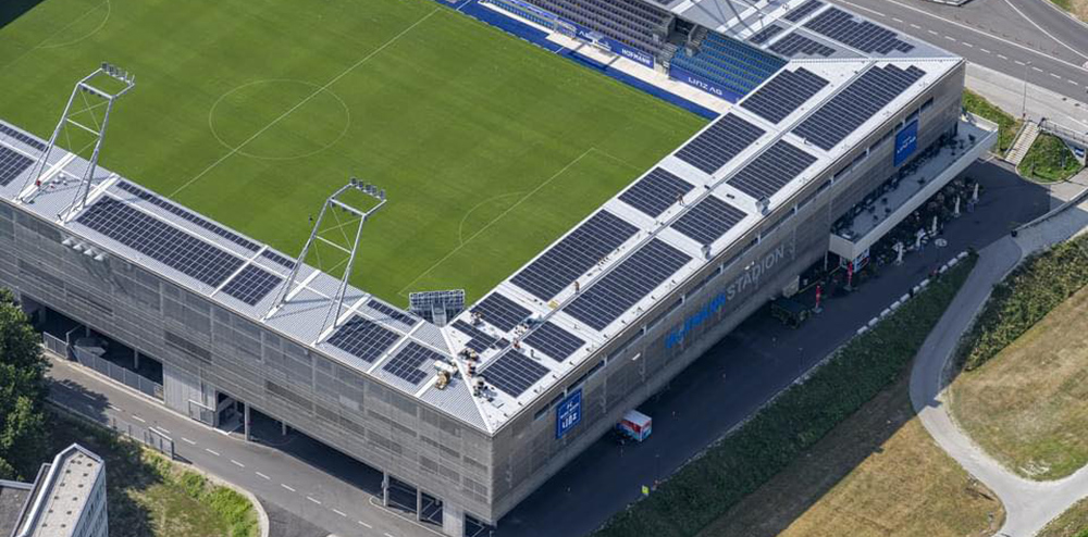 Top: Die Stadt Linz lässt in den nächsten Jahren auf städtischen Gebäuden über 100 PV-Anlagen errichten – eine der größten wurde bereits am Dach des Donauparkstadions umgesetzt. Etwa 200 Haushalte könnten alleine mit dieser 600 Kilowattpeak-Anlage versorgt werden. Auch am Dach des Neuen Rathauses wurden bereits PV-Module installiert, diese liefern allerdings „nur“ ein Drittel jener Leistung vom Donauparkstadion.