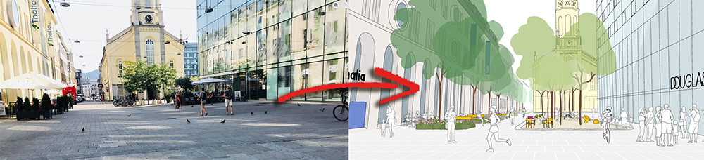 Mehrere Pflanzbeete und eine Schotterfläche sollen entstehen, dazu Neupflanzungen von Klimabäumen (Ulmen, und Lederhülsenbäume), ein Trinkbrunnen und Sitzmöbel, zusätzlich sind 90 Radabstellplätze vorgesehen.