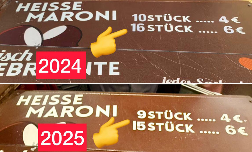 2010 kostete das Stück Maroni in Linz übrigens noch 18 Cent. Die Preissteigerung seit damals beträgt somit fast 150 Prozent. Rechnet man nur die tatsächliche Inflation seit 2010 (siehe Inflationsrechner auf Finanz.at), dürfte der Maronipreis pro Stück lediglich 27 Cent/Stück betragen. Zeigt einmal mehr: Manche Preise steigen unverschämt überproportional.