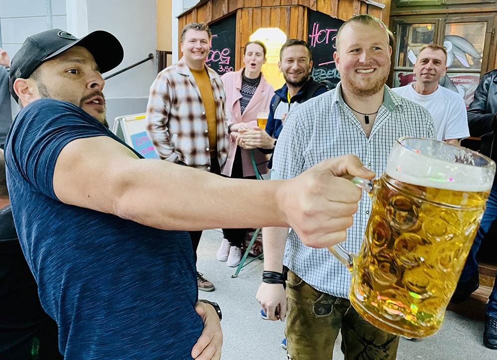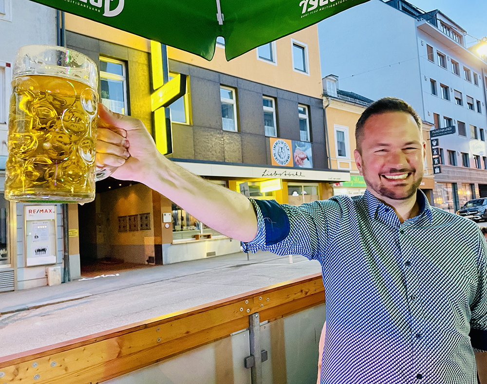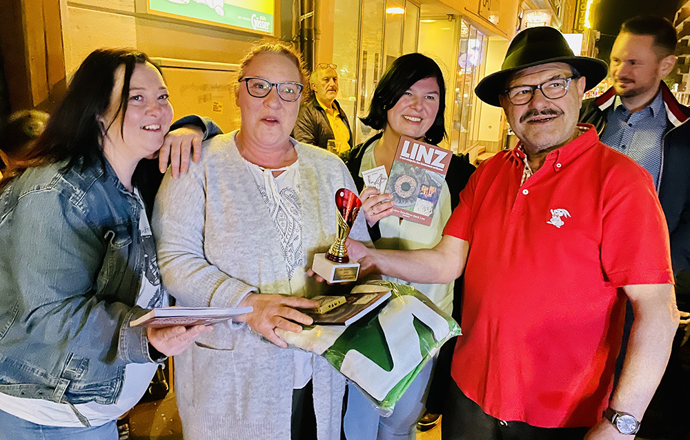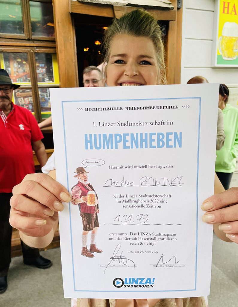 Linz hat die ersten Stadtmeister im Maßkrugstemmen: Beim vom LINZA stadtmagazin und dem Bierpub Hasenstall organisierten Wettkampf gab es mit 5:24:46min bei den Herren bzw. 2:46:12min bei den Damen sehr formidable Siegerzeiten – und zwei würdige neue Stadtmeister. Prrrrost!