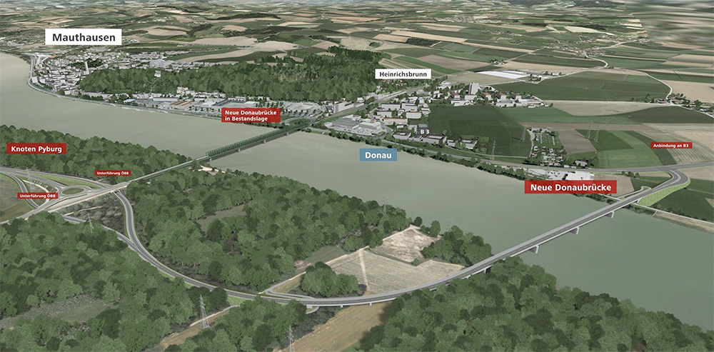 Nicht nur Linz, sondern auch ein paar Kilometer flussabwärts in Enns/Mauthausen gibt es ein massives Brückenproblem: Die dortige Donaubrücke ist schmal, alt und total überlastet. Darum entsteht hier ein weiterer Donauübergang – zwar nicht so prätentiös wie die Westring-Hängebrücke oder die Neue Eisenbahnbrücke, sondern nüchtern-zweckmäßig: Die 1961 erbaute Straßenbrücke wird bis 2027 durch eine neue ergänzt.