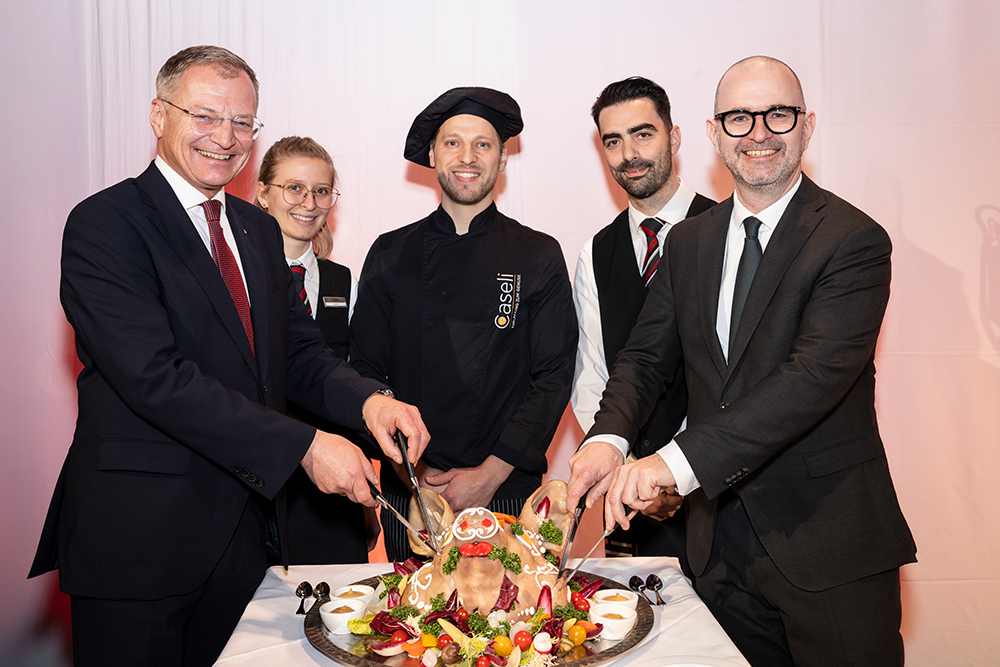 Beim traditionellen Sauschädelanschnitt „assistiert“ Landeshauptmann Thomas Stelzer. (Foto: Stadt Linz)
