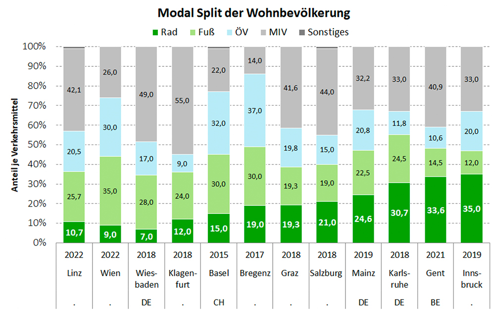 Jeder, der vom Auto auf ein anderes Fortbewegungsmittel umsteigt, bedeutet ein Auto weniger im Stau und somit einen wichtigen Beitrag zur Lösung des Stauproblems, so Hajart, der als Vorbild in Sachen Radanteil am Verkehr Städte wie Graz (19,3% Radanteil) oder Salzburg (21,0%) sieht. Bei der nächsten großen Verkehrserhebung im Jahr 2032 will man mit diesen beiden Cities auf Augenhöhe sein. Das erklärte Ziel für 2024 sei – neben einem weiteren Anstieg des Radfahranteils – vor allem der Ausbau der öffentlichen Verkehrsmittel, so Hajart.