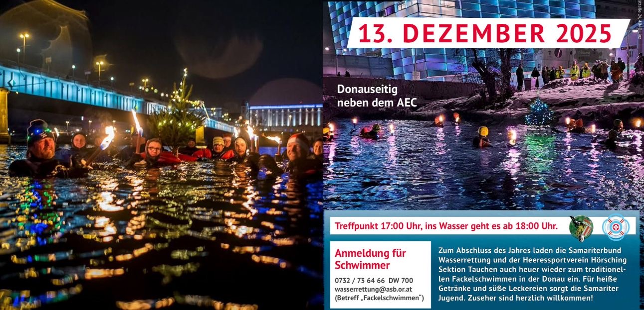 Am Sa. 13.12. ist es wieder so weit! Mutige Kaltwasser-Fans treffen sich zum legendären Fackelschwimmen in der Donau – ein unvergessliches Erlebnis für alle, die Kälte lieben und Gemeinschaft feiern. Treffpunkt: 17 Uhr beim Ars Electronica Center, Start: 18 Uhr – dann geht’s ab ins Wasser!