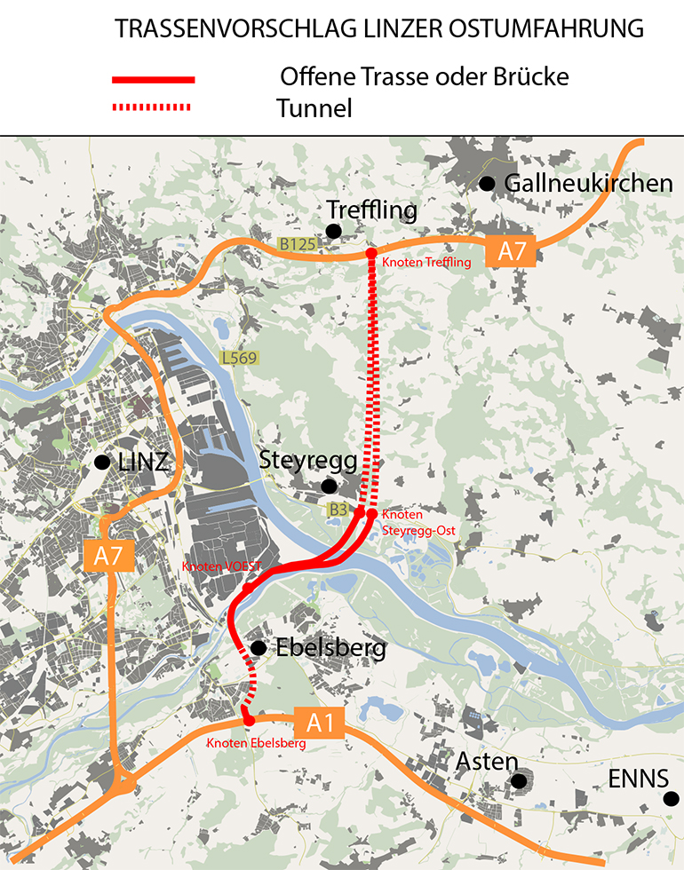 Die vom Land OÖ festgelegte Trasse der geplanten Linzer Ostumfahrung über Ebelsberg und Steyregg sorgt für Widerstand. Es gibt Befürchtungen, dass dadurch noch mehr Schadstoffe das Stadtgebiet belasten. „Da helfen auch keine Unterflurtrassen oder Tunnels, der Dreck bleibt in Linz“, warnt eine gemeindeübergreifende Allianz aus Linz und Steyregg. Die aktuelle Grenzwertsituation würde mit der stadtnahen Ostumfahrung endgültig kippen, so die Befürchtung. Als ersten Schritt will „Kein-Transit-durch-Linz“ 10.000 Unterschriften sammeln, um das Projekt von der Stadt weiter nach Osten zu rücken.