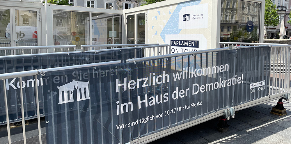 Parlament on Tour ist ein wanderndes Informationszentrum, wo sich Bürgerinnen und Bürger über die Grundwerte unserer Demokratie, über Parlamentarismus, die Geschichte unserer Demokratie und über das Hohe Haus selbst informieren können.