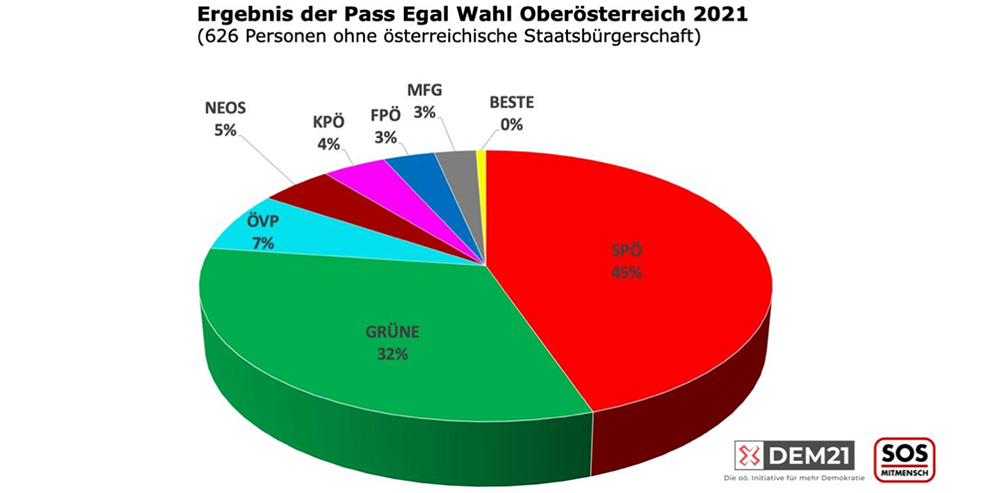 1.618 Stimmen wurden bei dieser symbolischen Wahl abgegeben, als Sieger ging die SPÖ mit 45% hervor, auf Rang 2: Die Grünen mit 32 Prozent. Rot-Grün hätte damit eine satte Zweidrittel-Mehrheit. Die beiden Regierungsparteien ÖVP und FPÖ kämen gemeinsam hingegen nur auf 10 Prozent. Auch die KPÖ fiel bei der „Pass Egal-Wahl“ durch und holte nur vier Prozent – nur einen Prozentpunkt vor MFG.