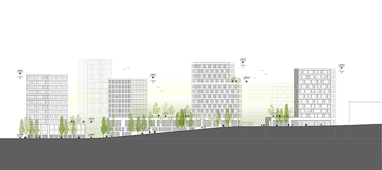 Knapp 200 Interessenten haben die Auslobungsunterlagen für den EU-weiten Wettbewerb angefordert. Das Siegerkonzept, das sich im ersten Schritt gegen 39 und in einer 2. Stufe letztlich gegen sieben verbliebene Vorschläge durchsetzen konnte, löste die schwierigen Rahmenbedingungen des rund vier Hektar großen Grundstücks am besten und fand laut Jury die gestalterisch ansprechendsten Antworten auf die gelegten Vorgaben.