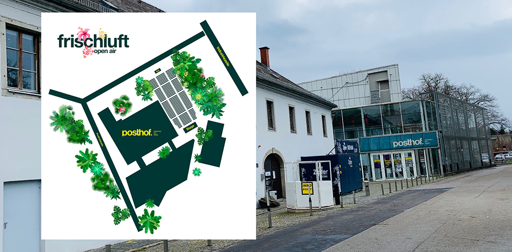 Mit der Initiative „FrischLuft“ erweitern die LIVA und der Posthof nun das umfangreiche Sicherheitskonzept. Die Ausdehnung des Areals im Innenhof an der nordöstlichen (Rück-)Seite des Hauptgebäudes, ein damit ermöglichtes großzügiges Platzierungskonzept und eine mobile, witterungstaugliche Bühne ergänzen die drei Indoor-Säle um eine flexible Openair-Variante.
