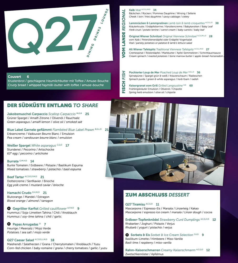 Zur Speisekarte: Kulinarisch setzt das Q27 auf eine moderne, internationale Linie mit mediterranen und österreichischen Einflüssen.