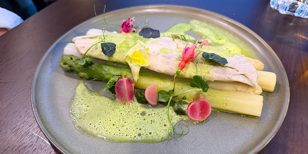 Getestet: Pochierter Loup de Mer mit Spinatpürree, grünem & weißem Spargel sowie Kräuterschaum & Radieschen um 36 Euro.