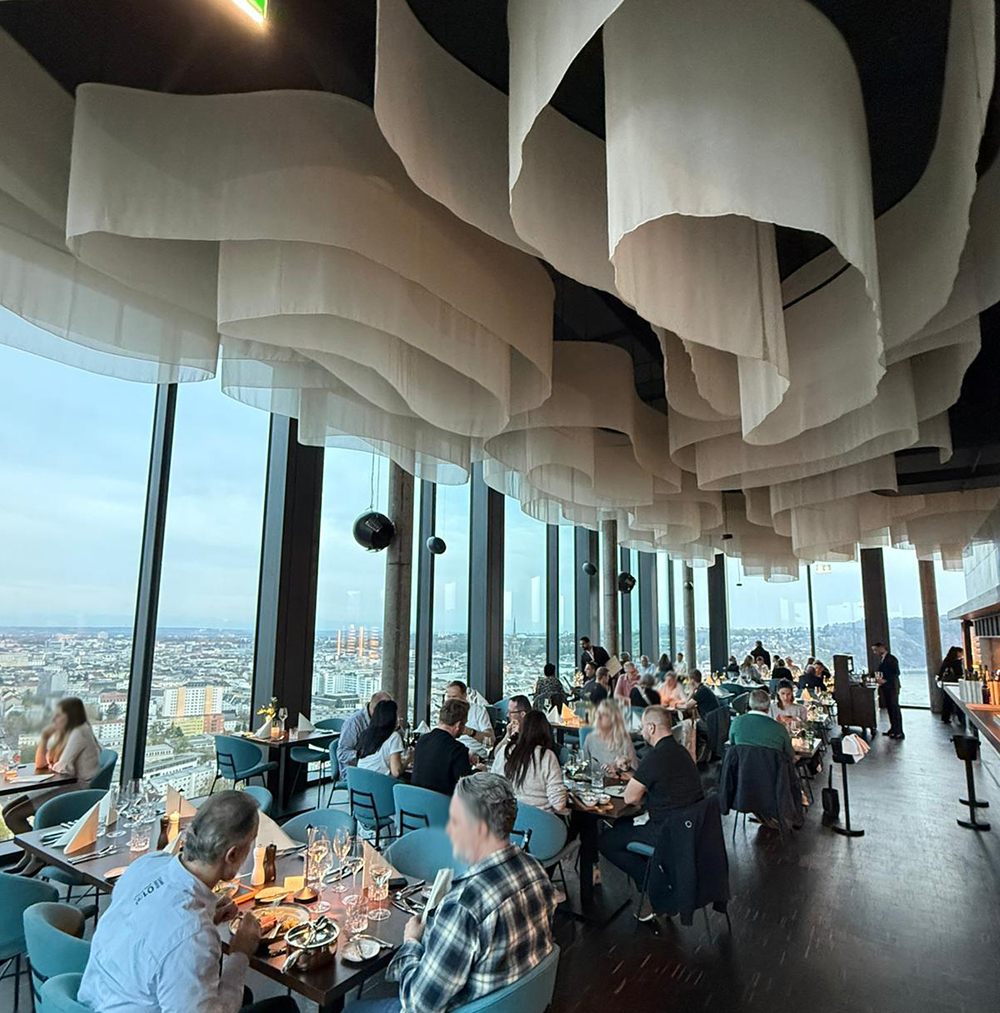 Das Idee vereint Restaurant, Sushi- und Cocktailbar samt Lounge mit umlaufenden Panoramafenstern. 120 Sitzplätze gibt’s im Innenbereich, direkt mit Tiefblick an der Glasfassade. 40 Plätze stehen im oben offenen Wintergarten zur Verfügung, der in den wärmeren Monaten geöffnet ist und dazwischen auch als Raucherterrasse dient. Zwei Expressaufzüge verbinden das Erdgeschoss mit dem 27. Stock, die Fahrt dauert weniger als 30 Sekunden.
